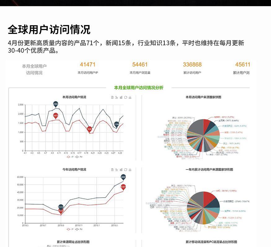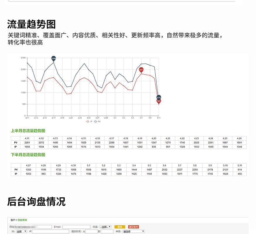 該客戶選擇的是外貿快車超級版A套餐,目前已合作2年,網站總達標天數701天。zui新排名在谷歌首頁的關鍵詞數量為1204個。客戶很注重網站更新及運營情況,4月份,客戶共計更新高質量內容的產品71個,新聞15條,行業知識13條,平時基本會維持在每月更新30-40個優質產品。在這么多高質量的頁面帶動下,網站的日均流量可達到1500個以上,共計帶來1268個詢盤(不包含直接發郵件至郵箱的詢盤)。