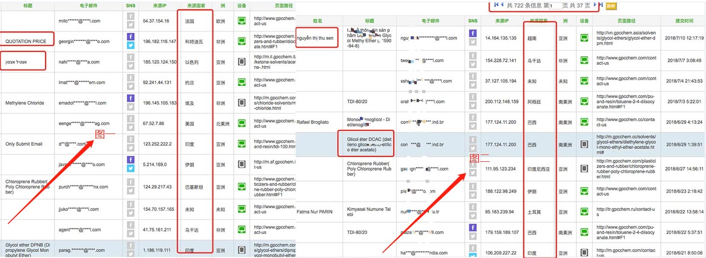 圖一中很多采購商習慣用母語訪問并發送詢盤;圖二總詢盤722個,很多非英語國家帶來的流量轉化的詢盤;