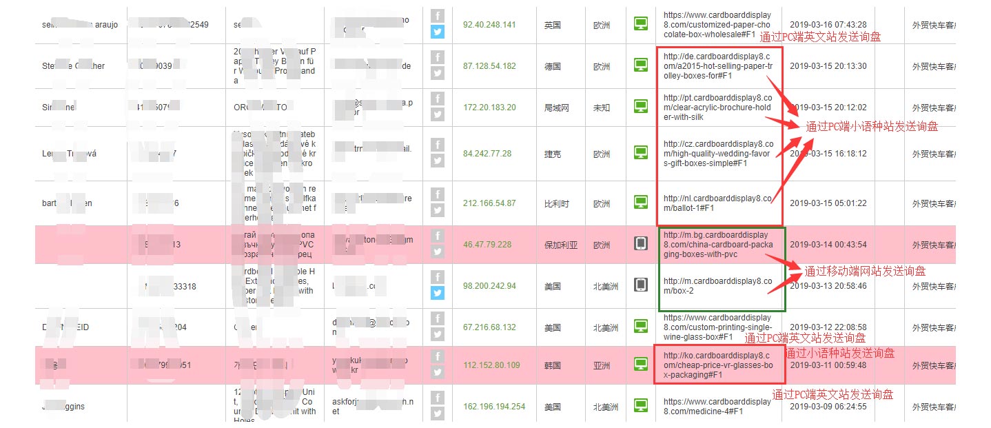 以下截圖為該客戶的部分詢盤,發現采購商通過小語種網站發送詢盤的占50%,采購商通過移動端站發送詢盤占20%,通過英文主站發送詢盤占30%,意味著,如果只做英文站的推廣,你將會損失掉70%的潛在客戶!